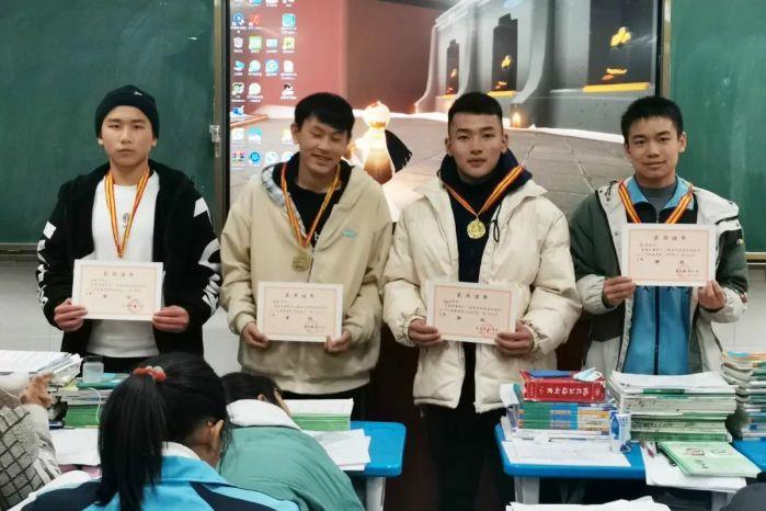 ▲?木坡布前(左一)在教室講臺領獎狀